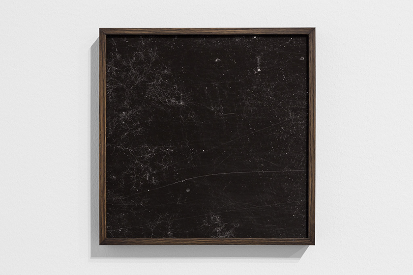 For the first instance, two suspended images outline the cliffs and the mighty inscrutable sea on an oxidized dark canvas. Both images were duplicated with no touch-ups. The other four images suggest abstract paintings, or maybe cosmic landscapes. What you see becomes undefined and unrecognizable, “reduced” to graphic elements — dots — which Blanqui equates with the universe and its continually changing structure. For these vision-like landscapes, Bilbao uses a “vernacular” approach — scratching and eroding the original images with implements created for the occasion, so there’s manual skill — a constant of her work — intervening, interpreting, suspending — ultimately setting free — time and space. The scratched — erased — negatives blur the original time-eroded images and rethink them as pure visual matter. From the actual, existing place, all that is left is a sound loop coming from an analog device — a 16mm movie projector — intruding between the viewer and the suspended images. So an object becomes a visual scar of sorts, a gash interrupting our experiencing of Blanqui’s tragic legacy and forcing us to come back to it again and again — the eternal recurrence Friedrich Nietzsche would write about. The projected light — a dynamic image in itself — leads to another visual cycle, defining an open ground for doubt and utopia (what could be more human than that?), and confronting the duplicated landscapes in all their density.